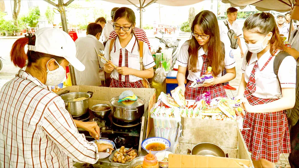 Học sinh chuộng thức ăn nhanh được bày bán trước cổng Trường THPT Tân Phong, quận 7, TPHCM. Ảnh: HOÀNG HÙNG