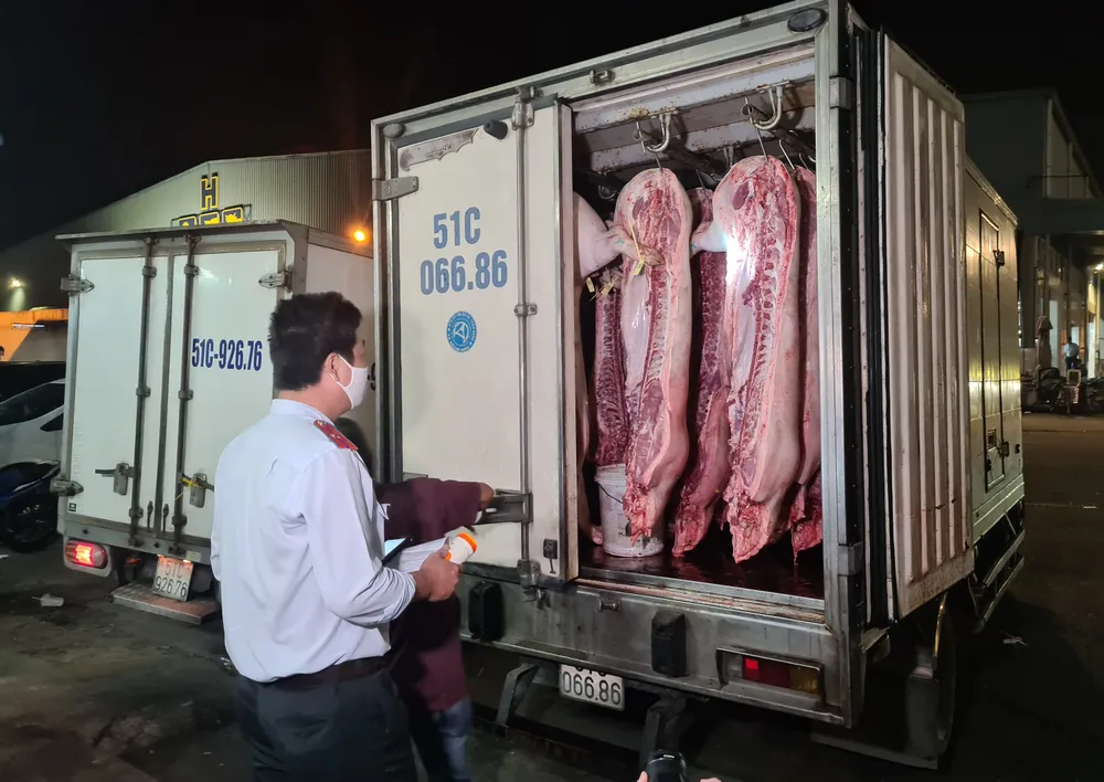 Lực lượng chức năng kiểm tra nguồn gốc thịt heo trước khi đưa vào chợ đầu mối nông sản thực phẩm Hóc Môn (TPHCM)
