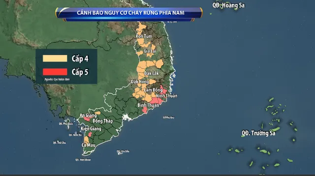 Theo Cục Kiểm Lâm, nhiều cánh rừng ở Tây Nguyên, Nam Bộ và Nam Trung Bộ cũng đang có nguy cơ cháy cao do các khu vực này đang trong cao điểm mùa khô, nắng khô nhiều ngày liên tiếp. Các diện tích rừng ở U Minh Thượng của Kiên Giang, Tịnh Biên, Tri Tôn, Châu Phú của An Giang và Ninh Thuận, Bình Thuận đã lên mức cảnh báo cháy cấp 5, cấp cực kỳ nguy hiểm. Ngoài ra, các cánh rừng ở Đồng Tháp, Cà Mau và Tây Nguyên cũng có nguy cơ cháy cấp 4. Bà con cần dừng việc sử dụng lửa trong và gần rừng thời gian này.