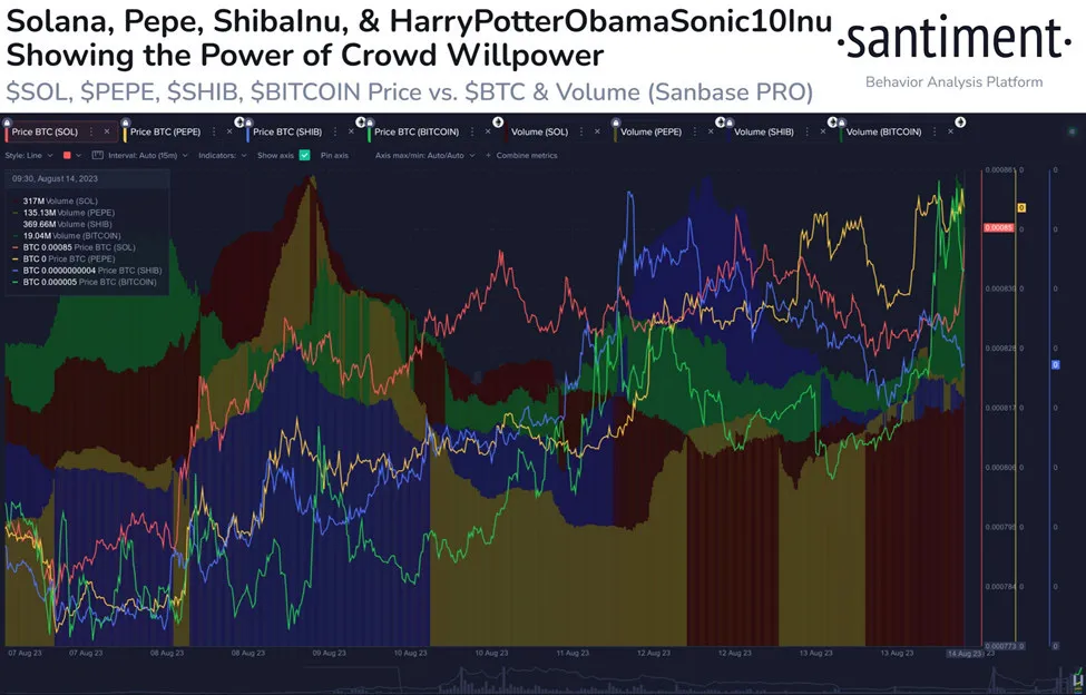 Solana, PEPE, SHIB và BTC cho thấy mức tăng đầu cơ. Nguồn: Santiment