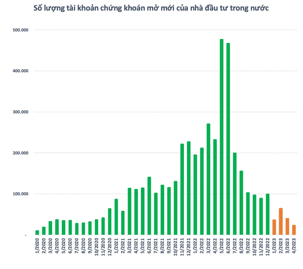 Theo số liệu từ Trung tâm lưu ký Chứng khoán Việt Nam (VSD), nhà đầu tư trong nước đã mở mới 22.740 tài khoản chứng khoán trong tháng 4. Con số này tiếp tục giảm hơn 16.800 tài khoản so với tháng trước và là mức thấp nhất trong vòng hơn 3 năm kể từ tháng 2/2020.