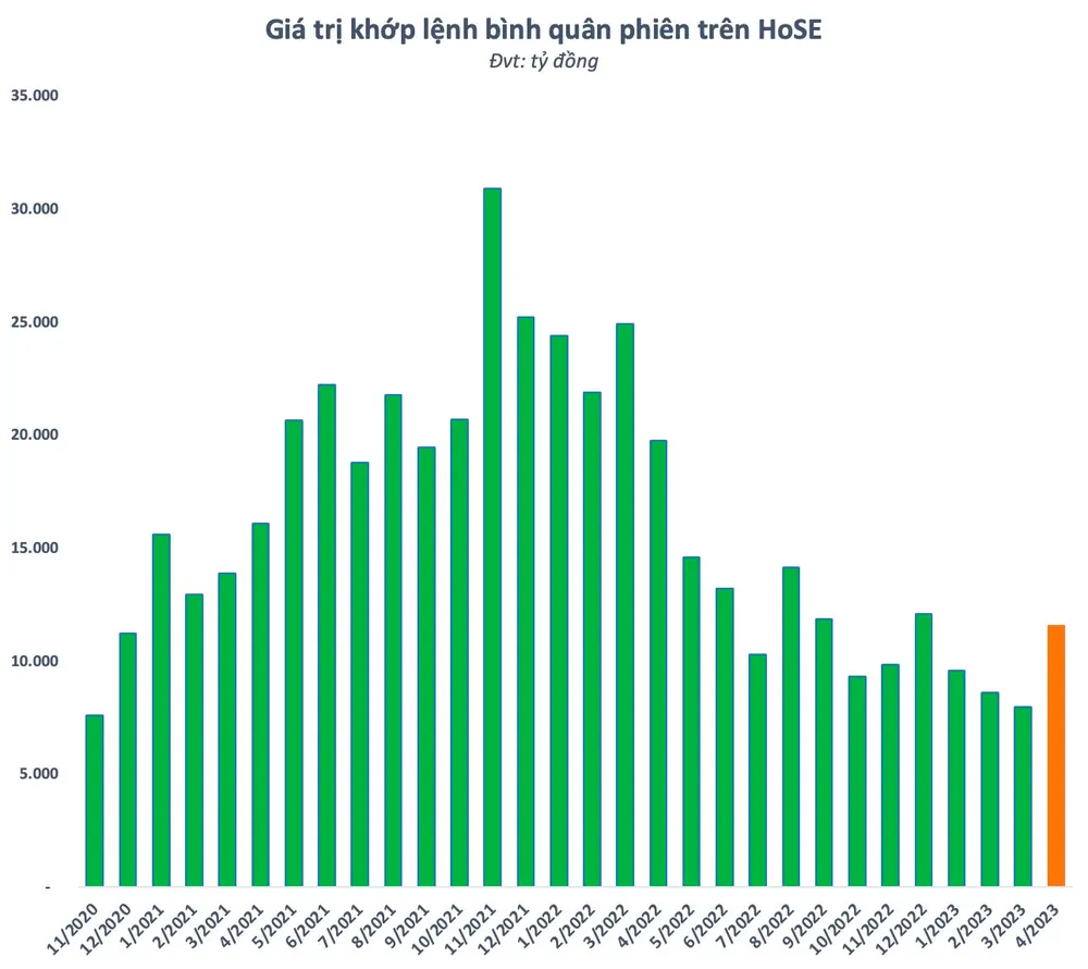 Số lượng tài khoản mở mới phá đáy nhưng thanh khoản thị trường lại bất ngờ được cải thiện đáng kể trong tháng 4 vừa qua. Giá trị giao dịch khớp lệnh bình quân phiên trên HoSE đạt hơn 11.500 tỷ đồng, tăng 45% so với mức rất thấp của tháng 3 trước đó. Giao dịch sôi động hơn phần nào đó đến từ việc một lượng nhà đầu tư quay trở lại thị trường sau một thời gian “nghỉ chơi” hoặc margin được kích hoạt sau khi lãi suất có xu hướng quay đầu giảm.
