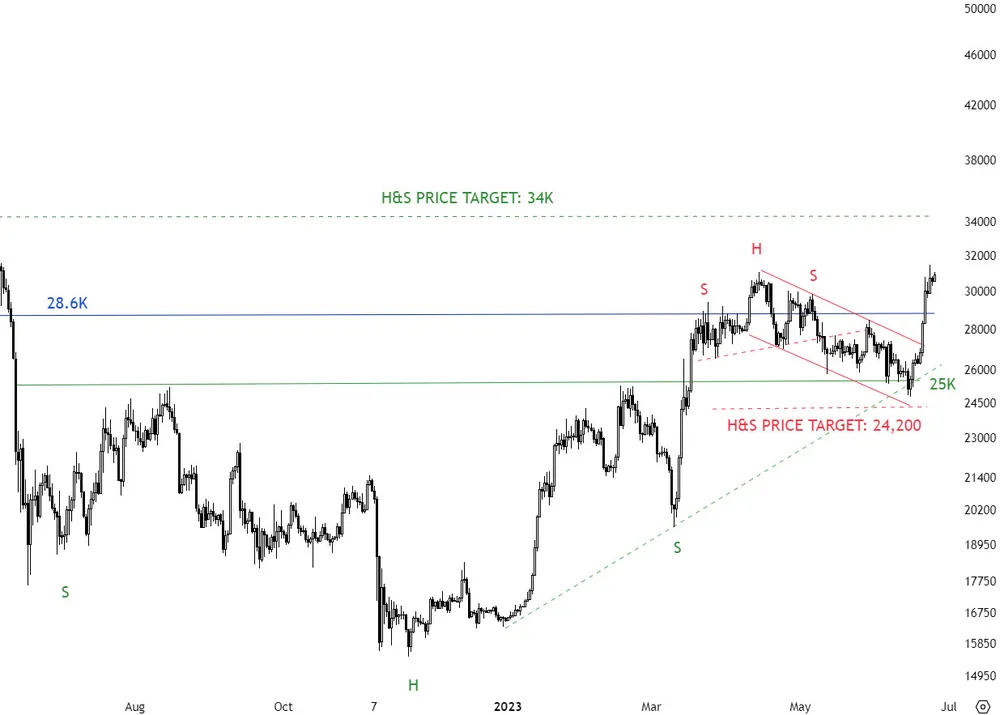 Phân tích của Kibar dựa trên mô hình vai đầu vai (H&S), cho thấy tâm lý lạc quan mạnh mẽ trên thị trường sau khi vua tiền điện tử breakout gần đây.