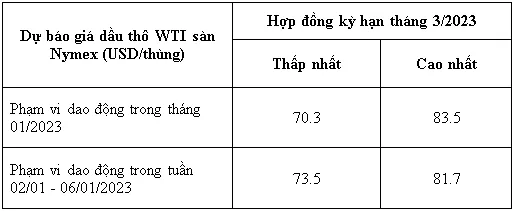 Trong phạm vi tháng 1/2023, dự kiến hợp đồng kỳ hạn tháng 3/2023 dao động với giá trung bình tương đương tháng 12/2022, trong phạm vi từ 70.3 – 83.5 USD/thùng.