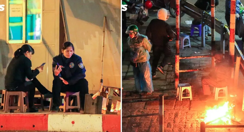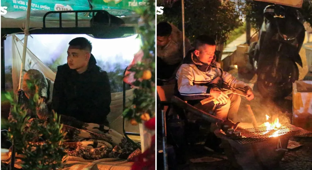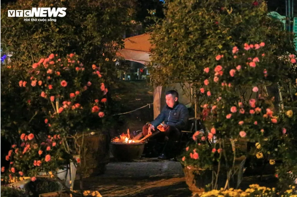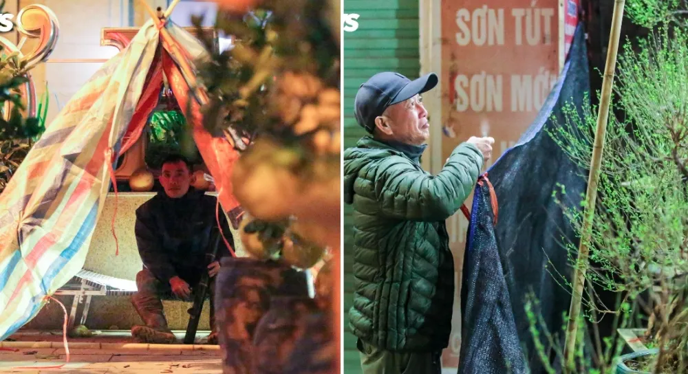 Tối 22/1, Hà Nội chìm trong gió rét, lạnh tê tái. Cái lạnh ''cắt da, cắt thịt'' khiến cuộc sống mưu sinh của những người lao động ngoài đường phố giữa đêm khuya càng vất vả hơn. Khoảng 23h, nền nhiệt ngoài trời ở mức 8 độ C. Trên nhiều con đường, góc phố Thủ đô, những người bán cây cảnh, những xe chở hàng, các chị lao công... vẫn miệt mài với công việc của mình. Dọc đường Lạc Long Quân là nơi tập trung nhiều người buôn bán cây cảnh, đào, quất thời vụ. Đêm 22/1, gió mạnh, người bán cây phải chăng bạt, be bịt kỹ càng để bảo vệ cây không rụng hoa, gãy cành. Ngồi bên đống lửa để sưởi ấm, anh Trần Văn Hiếu (quê Vĩnh Phúc), tiểu thương bán cây cảnh dịp Tết trên đường Lạc Long Quân chia sẻ, dù đã quen với cảnh “màn trời, chiếu đất” nhưng cái lạnh vẫn là nỗi khiếp sợ đối với những người buôn bán phải trông cây đêm như anh. “Mấy ngày trước Hà Nội vẫn còn nắng ấm, hôm nay bất chợt chuyển lạnh khiến tôi chưa kịp thích nghi. Để giữ ấm tôi đành nhóm lửa sưởi, mang thêm chăn, áo ấm để có giấc ngủ tạm qua đêm”, anh Hiếu nói. Anh Hiếu cho biết thêm, năm nào cũng vậy, anh sợ nhất vẫn là những trận mưa kèm rét sâu, khách ngại ra đường nên cây cảnh tiêu thụ chậm hơn.