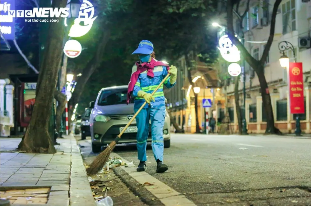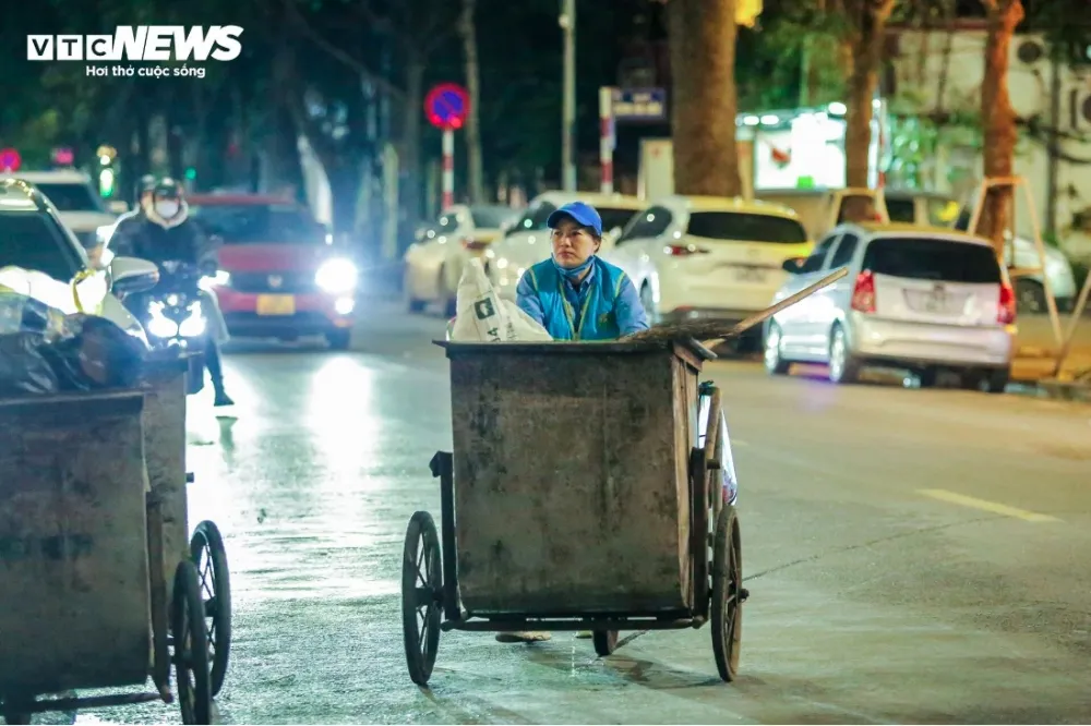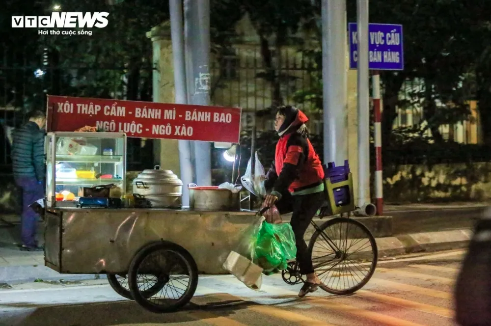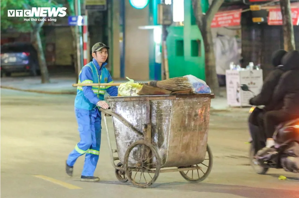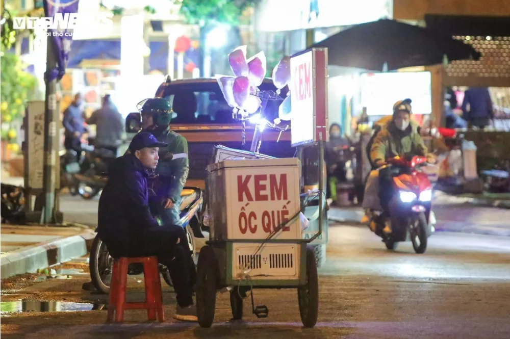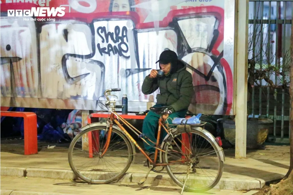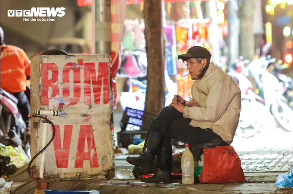 Đối với những người buôn cây cảnh Tết, họ phải ăn ngủ ngay trên vỉa hè để trông hàng. Những trận mưa, gió lạnh khiến mỗi đêm trở nên dài và cực nhọc hơn. Cách đó không xa, ông Vàng A Lăng (55 tuổi, quê Mộc Châu) nằm co ro trong chiếc lều tạm để trông những chậu đào mới được chuyển về đây. “Tôi được thuê trông bán cây, vốn đã quen với cái lạnh trên vùng cao nên thời tiết Hà Nội có lạnh thế, lạnh nữa tôi vẫn chịu được. Nhưng hôm nay vắng khách quá, chẳng biết làm gì đành vào lều nằm tạm, mong rằng hôm sau thời tiết ủng hộ để lượng khách mua sắm ổn định lại”. Những công nhân vệ sinh môi trường vẫn lặng lẽ làm công việc thường ngày của mình trong mọi ngõ ngách của Hà Nội. Trên đường Tràng Thi, chị Phương Hà (48 tuổi, quê Hà Nam) chỉ mặc bộ quần áo vừa vặn không quá dày để làm công việc của mình được linh hoạt. “Tôi làm công việc này được 10 năm, một buổi làm việc của tôi bắt đầu từ 17h đến 2h sáng hôm sau. Những ngày nắng ấm còn đỡ, chứ như hôm nay cực lắm, bởi thời điểm làm việc chính là lúc nhiệt độ xuống thấp nhất trong ngày. Nhiều khi nghĩ cũng hơi chạnh lòng khi thời gian này mọi người đang sum vầy với gia đình hay có một giấc ngủ ngon, nhưng vì “cơm áo, gạo tiền” nên phải chấp nhận", chị Hà chia sẻ. Đi quanh các con phố Hà Nội, không khó để bắt gặp những người lao động tự do làm đủ các nghề khác nhau vẫn miệt mài trong cái lạnh thấu xương để mưu sinh. Trời lạnh, người dân hạn chế ra đường, việc buôn bán ế ẩm. Nhiều người lao động chia sẻ, dù biết sẽ vắng khách nhưng ở nhà không có tiền, mất mối khách nên đành cố gắng, được đồng nào hay đồng đó. Người đàn ông cao tuổi làm nghề bơm, vá xe ngồi co ro trên vỉa hè cùng quầy hàng của mình. Trời đã về khuya, nhưng ông vẫn cố chờ thêm vài phút với hy vọng sẽ có khách.