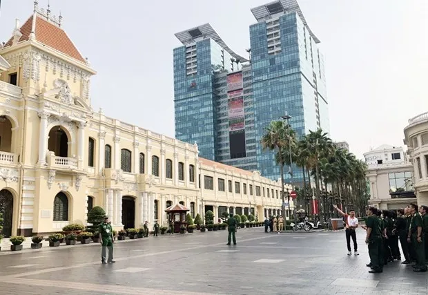 Du khách tham quan Di tích Kiến trúc Nghệ thuật cấp Quốc gia Trụ sở Hội đồng Nhân dân và Ủy ban Nhân dân Thành phố Hồ Chí Minh. (Ảnh: Mỹ Phương/TTXVN)