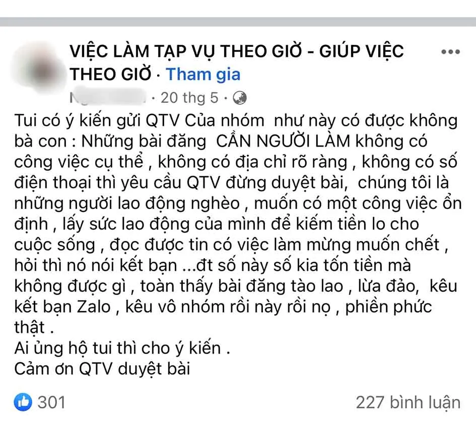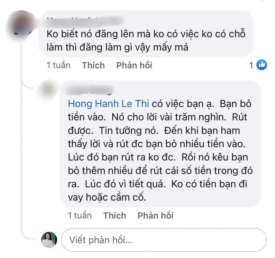 Liên tiếp để lại bài viết cảnh báo trước thông tin tuyển dụng “Cần người làm…” trên các nhóm tìm việc và hội nhóm gen Z, Phan Nguyễn Ngọc Minh (30 tuổi, nhân viên lập trình, ngụ quận 6) chia sẻ: “Tôi chứng kiến mấy vụ bị lừa vì các bài viết tuyển dụng kiểu này rồi, nên cứ rảnh là đăng tin trong mấy nhóm đang thu hút nhiều người tìm việc tham gia, để cảnh báo mọi người. Nhẹ thì có người mất vài triệu đồng, nặng thì bán nhà bán cửa luôn, vì đầu tư tiền ảo ban đầu có lợi nhuận, ham làm giàu cứ đổ tiền thêm, tụi lừa đảo gom đủ thì cho sập sàn giao dịch, lúc đó nó ôm tiền, còn mình ôm nợ”.