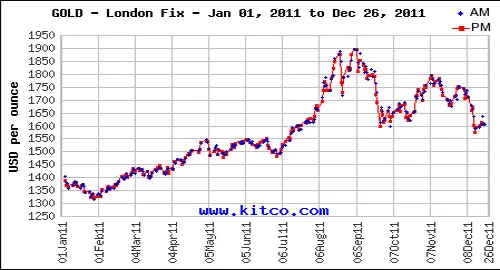 Khép lại một năm biến động đầy kịch tính, giá vàng cuối năm 2011 dao động nhẹ quanh mốc 1.600 USD/ounce trên thị trường quốc tế và 43 triệu đồng/lượng trên thị trường Việt Nam.