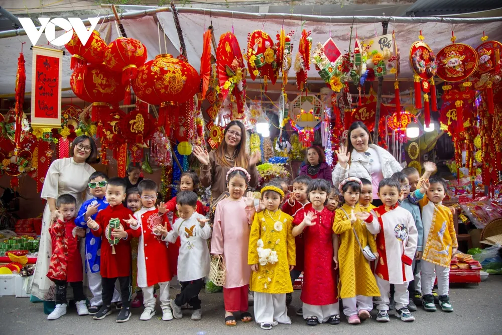 Không chỉ là nơi mua sắm, chợ Đổ còn được nhiều bạn trẻ đến tham quan, chụp ảnh. Chị Tống Thị Giang (TP. Hải Phòng) hào hứng chia sẻ: "Ngày hôm nay chúng tôi đưa các con đến trải nghiệm không gian trang trí Tết và những gian hàng bánh kẹo. Rất là vui nhộn, đã có một tý không khí vào ngày Tết rồi”.