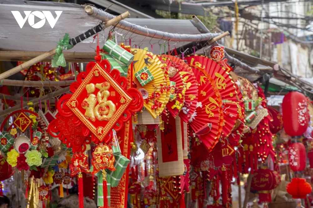 Cả con phố Phan Bội Châu ở khu vực chợ Đổ được phủ kín bởi màu sắc rực rỡ của lồng đèn, câu đối, quạt, khánh treo may mắn... và những đồ vàng mã phục vụ cho ngày Tết