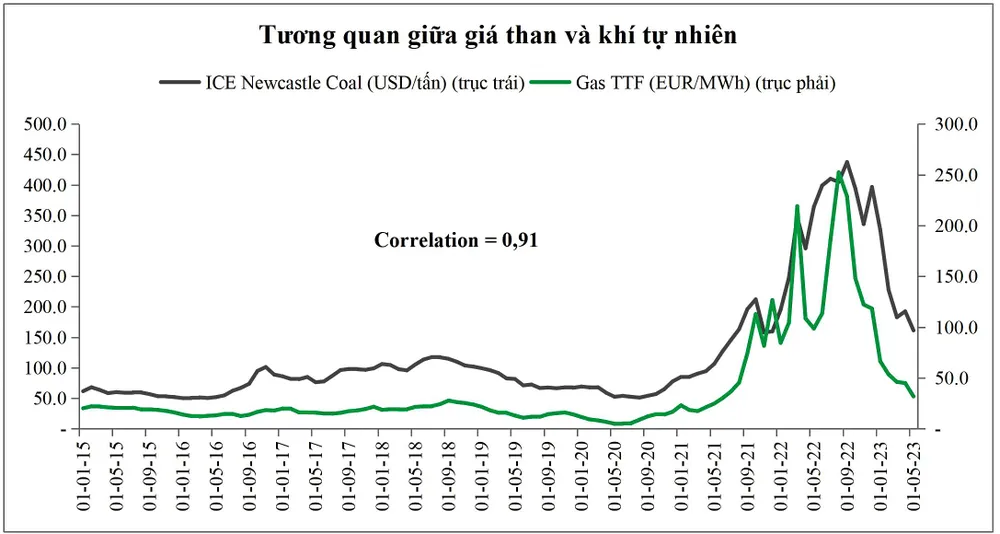 Quan sát đồ thị giá than giai đoạn 2021-2022 tựa như cơn sóng thần đã trải qua. Hiện tại, trong khi các nguồn năng lượng tái tạo như gió và mặt trời dự kiến chiếm thị phần lớn hơn trên thị trường năng lượng châu Âu trong năm nay, khí đốt vẫn là nhiên liệu chính để sản xuất điện khi Đức và Bỉ đóng cửa các nhà máy hạt nhân. Với việc giá khí đốt duy trì ở mức thấp và xu hướng chuyển dịch qua năng lượng sạch, dự kiến tiếp tục đè nặng lên giá than thời gian tới.