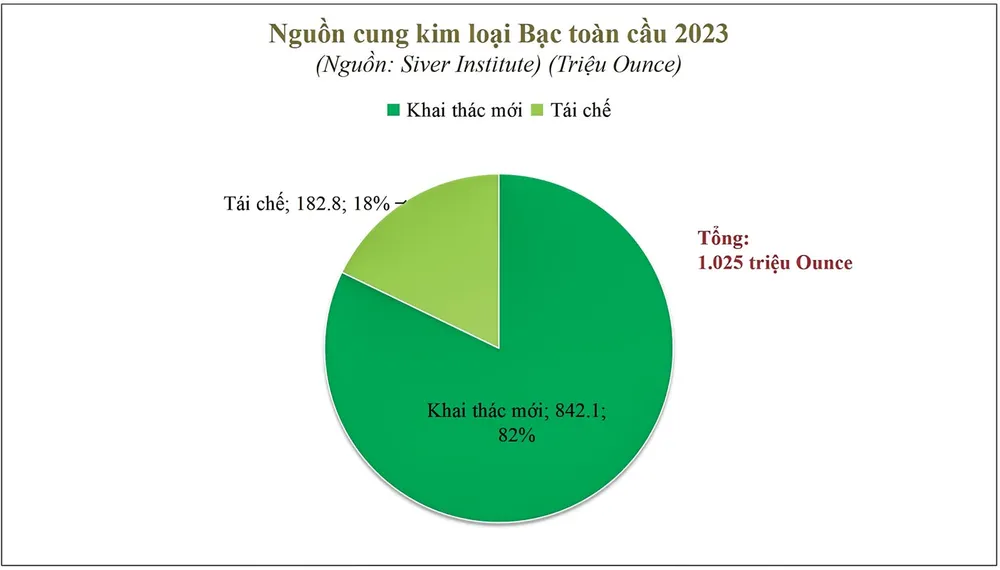 Phía nguồn cung sau khi chứng kiến sản lượng khai thác mới giảm xuống còn 822,4 triệu ounce trong năm 2022, sản lượng khai thác mới của năm nay được dự báo tăng 2,4%, đạt 842,1 triệu ounce. Nguồn cung bạc từ tái chế dự kiến không thay đổi nhiều so với năm ngoái.