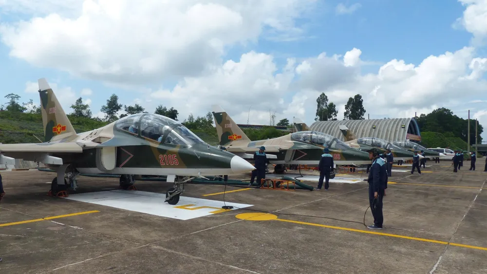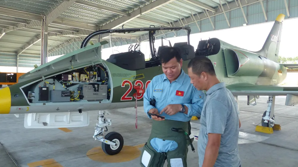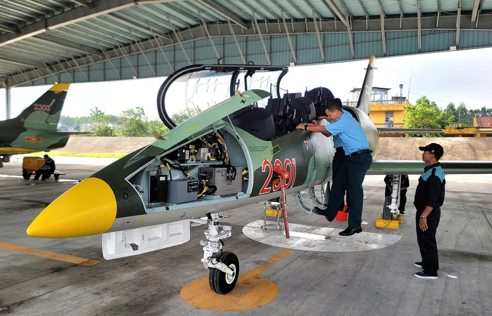 Các kỹ thuật viên kiểm tra an toàn kỹ thuật của máy bay L-39NG trước giờ cất cánh thực hiện nhiệm vụ
