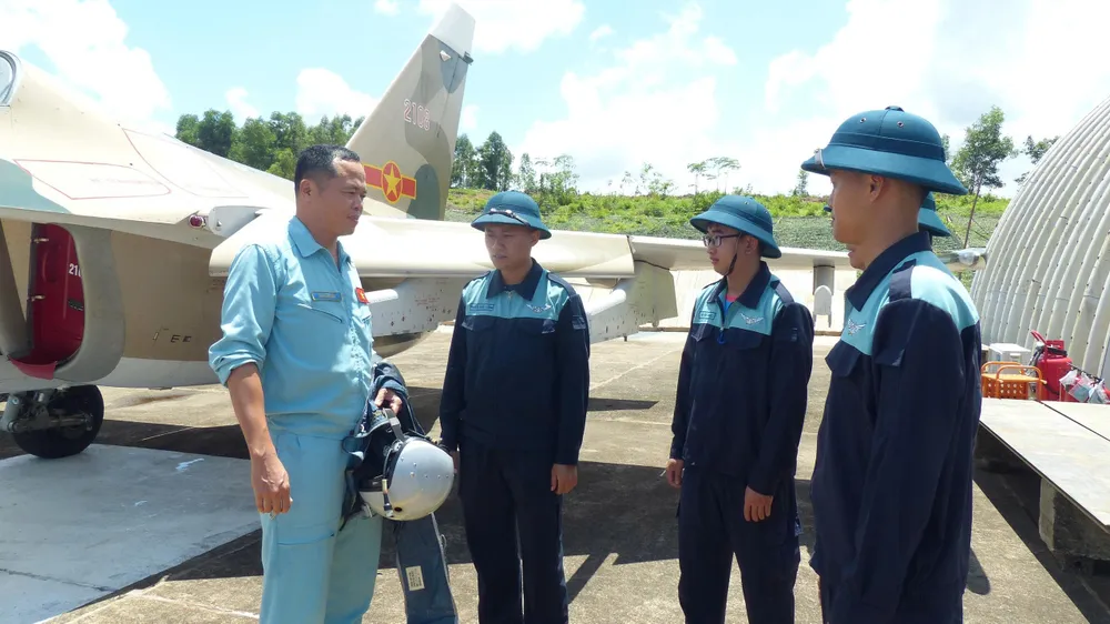 Thượng tá Hoàng Hải đang trao đổi với các kỹ thuật viên trước khi thực hiện nhiệm vụ bay huấn luyện