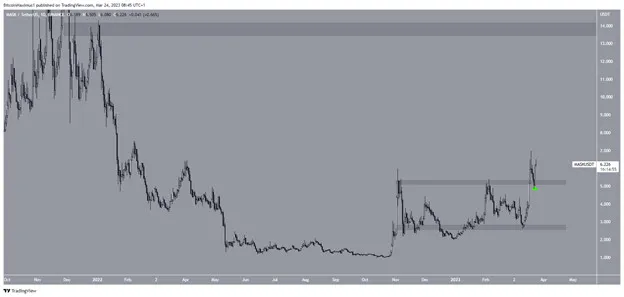 Giá MASK đã tăng mạnh kể từ tháng 11-2022. Trong khi đà tăng bị đình trệ bên dưới vùng kháng cự 5,95 USD, giá cuối cùng đã bứt phá lên trên vùng này. Giá hiện đang trong quá trình xác nhận nó là hỗ trợ. Nếu đà tăng tiếp tục, vùng kháng cự tiếp theo sẽ là 13,80 USD.