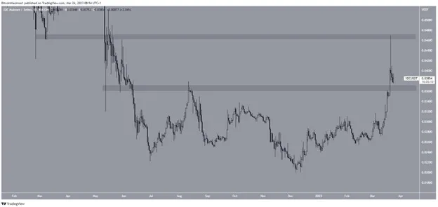 Giá XDC đã tăng kể từ đầu năm, tạo ra một đáy cao hơn trong tháng Ba. Điều này đã tạo sự bứt phá lên trên vùng kháng cự 0,036 USD và đạt mức cao hàng năm mới ở 0,047 USD vào ngày 21-3.