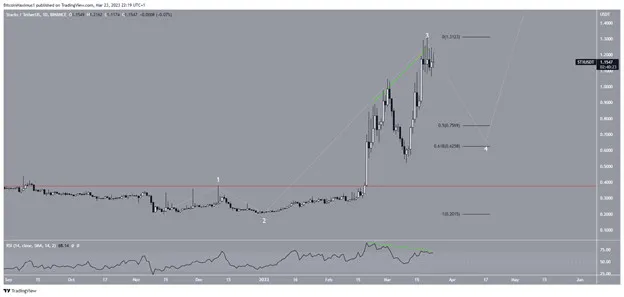 Tuy nhiên, mức cao được kết hợp với sự phân kỳ giảm giá trong chỉ số RSI hàng ngày (đường màu xanh lá cây). Ngoài ra, giá STX có thể đã hoàn thành sóng ba của chuyển động đi lên gồm năm sóng (màu trắng).