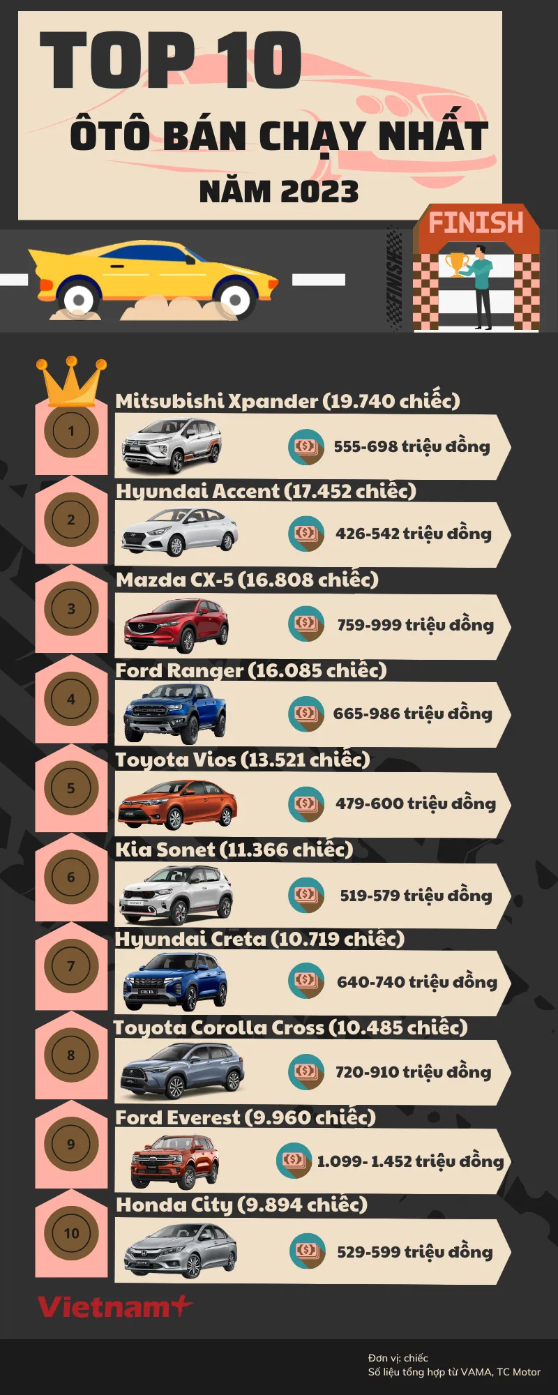 Phía dưới là danh sách cụ thể 10 mẫu ôtô bán chạy nhất năm 2023: