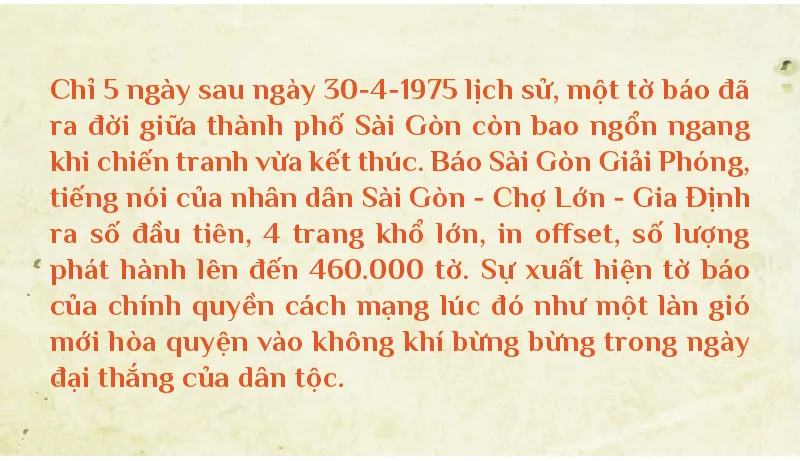 Khuya 5-5-1975, Báo Sài Gòn Giải Phóng số 1 ra đời. Đêm đó, tòa soạn như một ngày hội. Số lượng bài và hình ảnh chuẩn bị đủ để in vài chục trang. Báo chỉ có 4 trang, nên phải chọn lọc thật cần thiết cho số ra mắt. Bài xã luận lấy cảm hứng từ bài thơ Toàn thắng về ta của nhà thơ Tố Hữu, được xử lý lại và đặt tít vào giờ chót. Loạt tin và bài viết về cuộc sống Sài Gòn trong những ngày đầu tiếp quản đã phát huy tác dụng. Tờ báo đã cho thấy không khí nô nức mừng chiến thắng và ý thức công dân chuẩn bị bắt tay vào xây dựng chính quyền mới, xã hội mới.