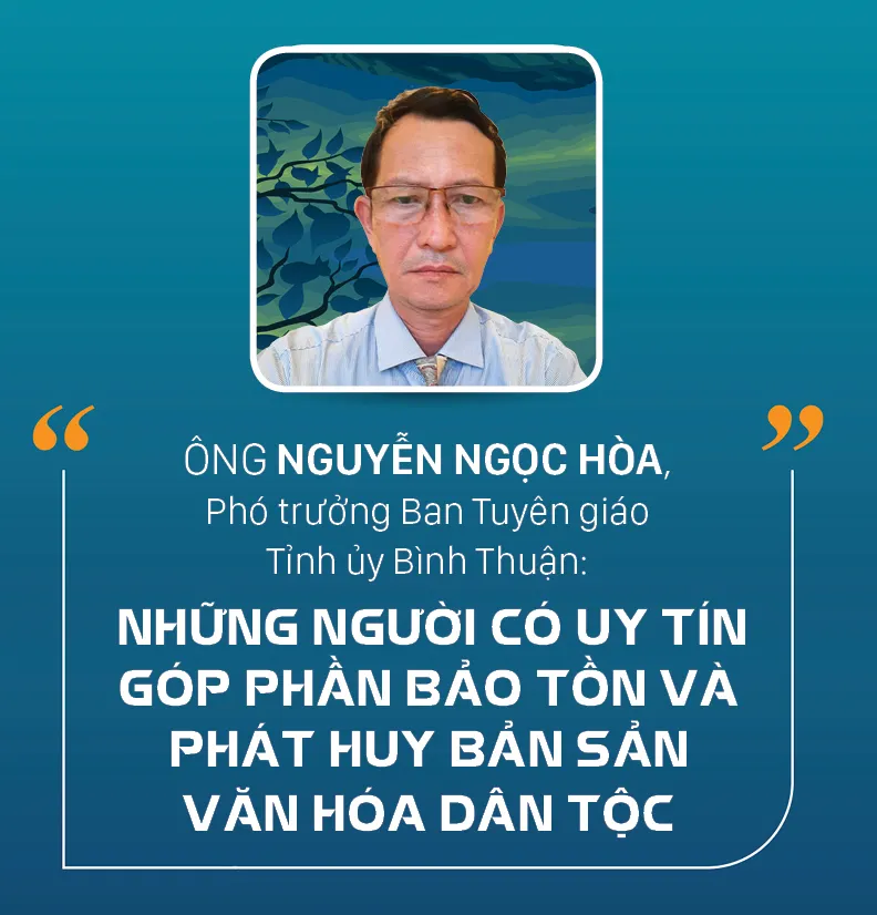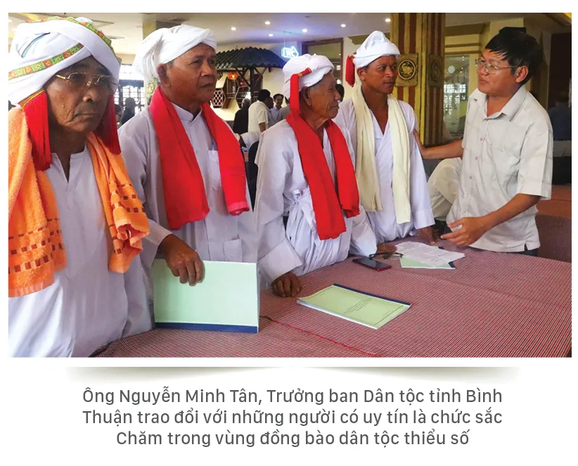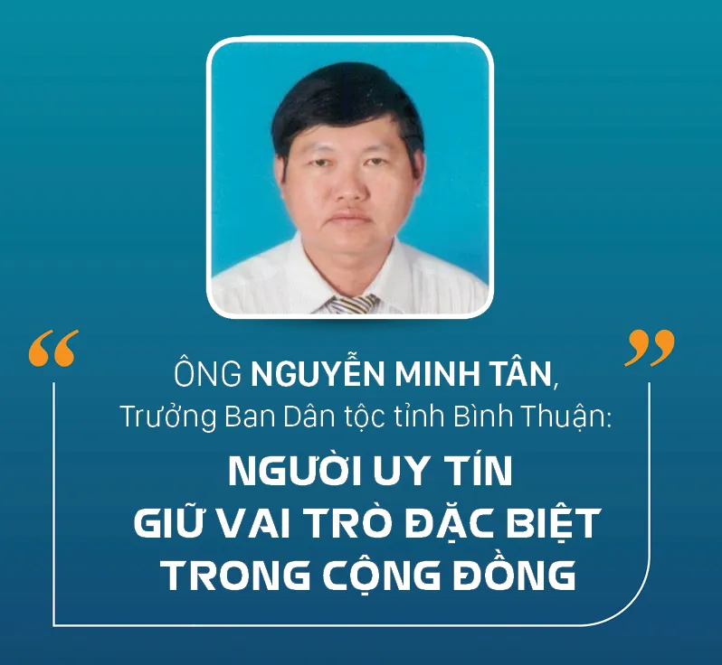 Hiện nay, toàn tỉnh Bình Thuận có 87 người có uy tín, xuất thân từ nhiều thành phần, dân tộc, ngành nghề, trình độ khác nhau, như: Già làng, tộc trưởng, chức sắc, thầy cúng, thầy mo,… Đội ngũ này có vai trò hết sức quan trọng trong công tác tuyên truyền, vận động đồng bào tham gia, hưởng ứng tích cực các phong trào thi đua yêu nước; chấp hành tốt các chủ trương, đường lối của Đảng, chính sách và pháp luật của Nhà nước về công tác dân tộc, chính sách dân tộc và đại đoàn kết dân tộc.