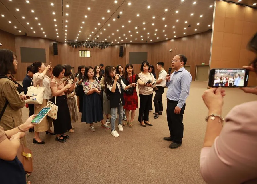 Ông Vũ Quốc Huy, Giám đốc Trung tâm Đổi mới sáng tạo quốc gia (NIC), giới thiệu với báo chí về các khu chức năng của NIC.