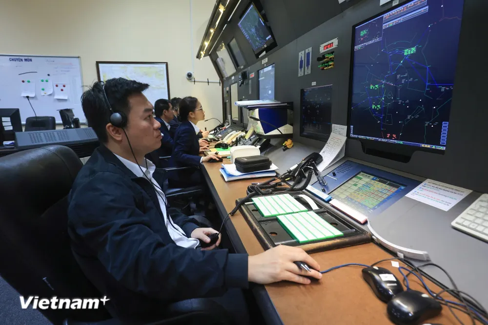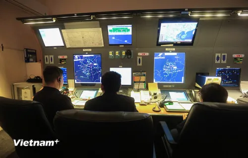 Trung tâm kiểm soát tiếp cận tại sân - Sân bay Nội Bài có nhiệm vụ kiểm soát các chuyến bay tiếp cận về hạ cánh và những chuyến bay khởi hành từ Nội Bài trong bán kính 75km từ sân bay. (Ảnh: Việt Hùng/Vietnam+)
