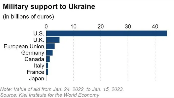 Ngân sách viện trợ quân sự cho Ukraine của Mỹ, Anh, EU, Đức, Canada, Italy, Pháp và Nhật Bản từ 24/1/2022 đến 15/1/2023. Nguồn : Viện Kiel về kinh tế thế giới