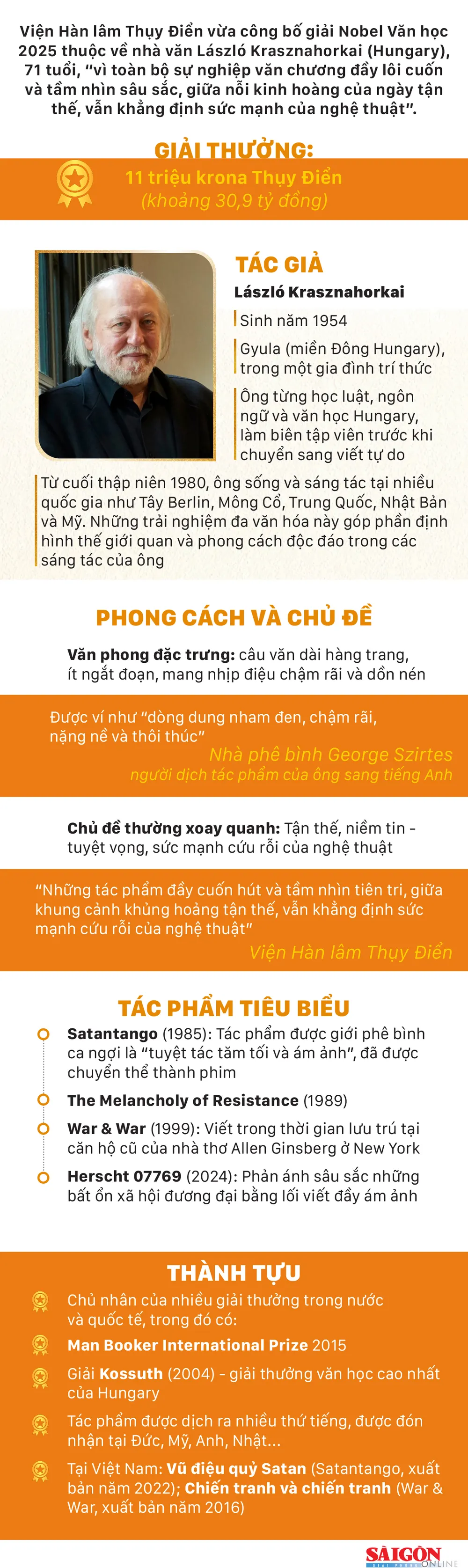 (ĐTTCO)-Viện Hàn lâm Thụy Điển vừa công bố giải Nobel Văn học 2025 thuộc về nhà văn László Krasznahorkai (Hungary), 71 tuổi, "vì toàn bộ sự nghiệp văn chương đầy lôi cuốn và tầm nhìn sâu sắc, giữa nỗi kinh hoàng của ngày tận thế, vẫn khẳng định sức mạnh của nghệ thuật".