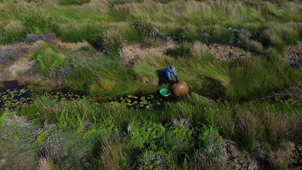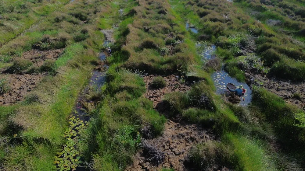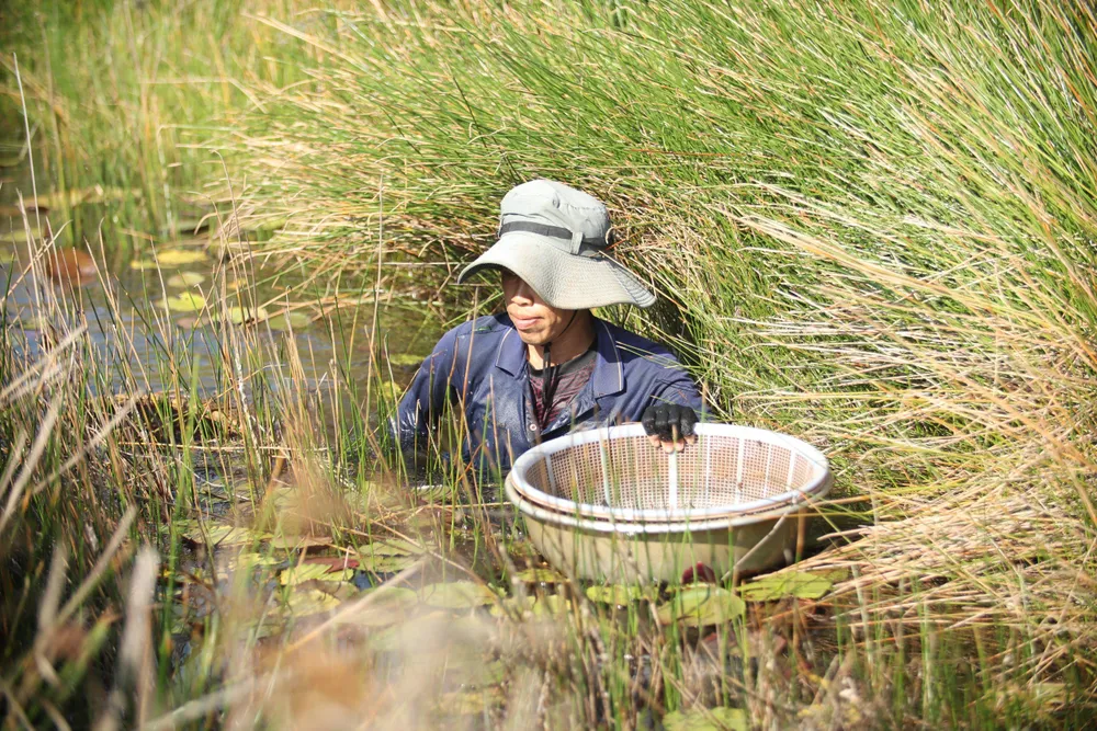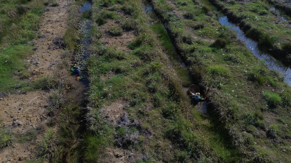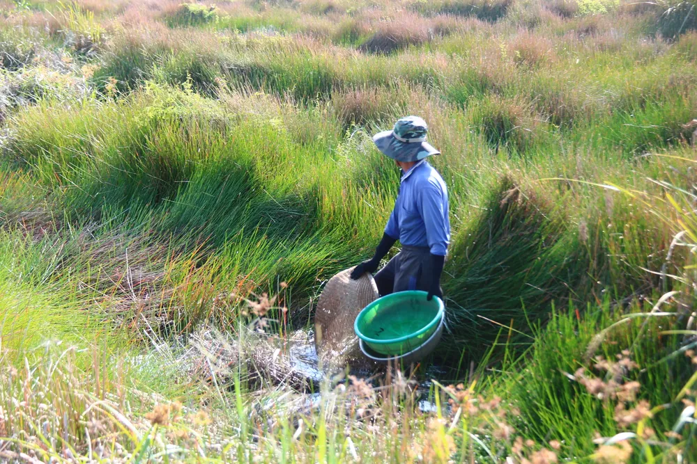 Người dân phải trầm mình cả ngày dưới trảng cỏ, vạt năn ở đầm lầy và phải vận động liên tục trên đồng nước để quay cù