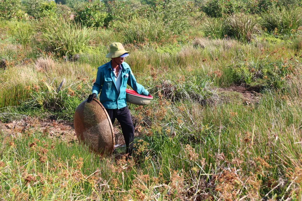 Người dân chia thành từng nhóm nhỏ để đi tìm đồng hoang dặm cá lia thia