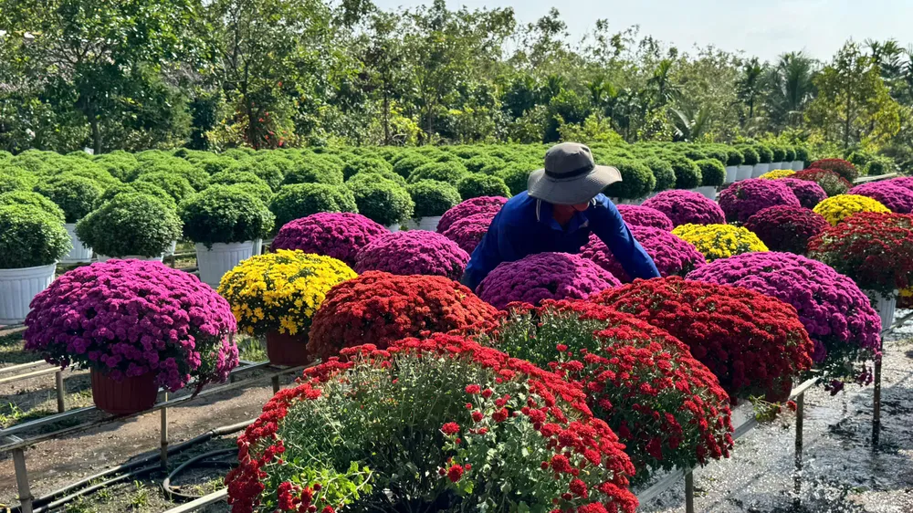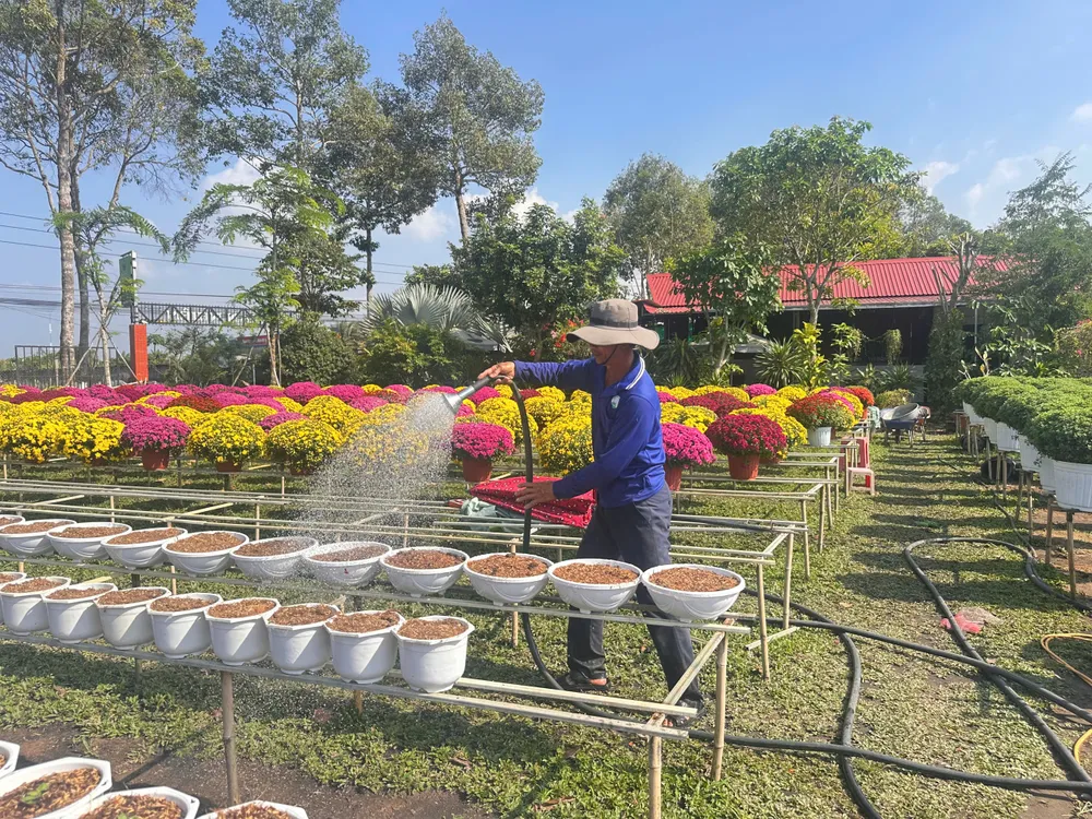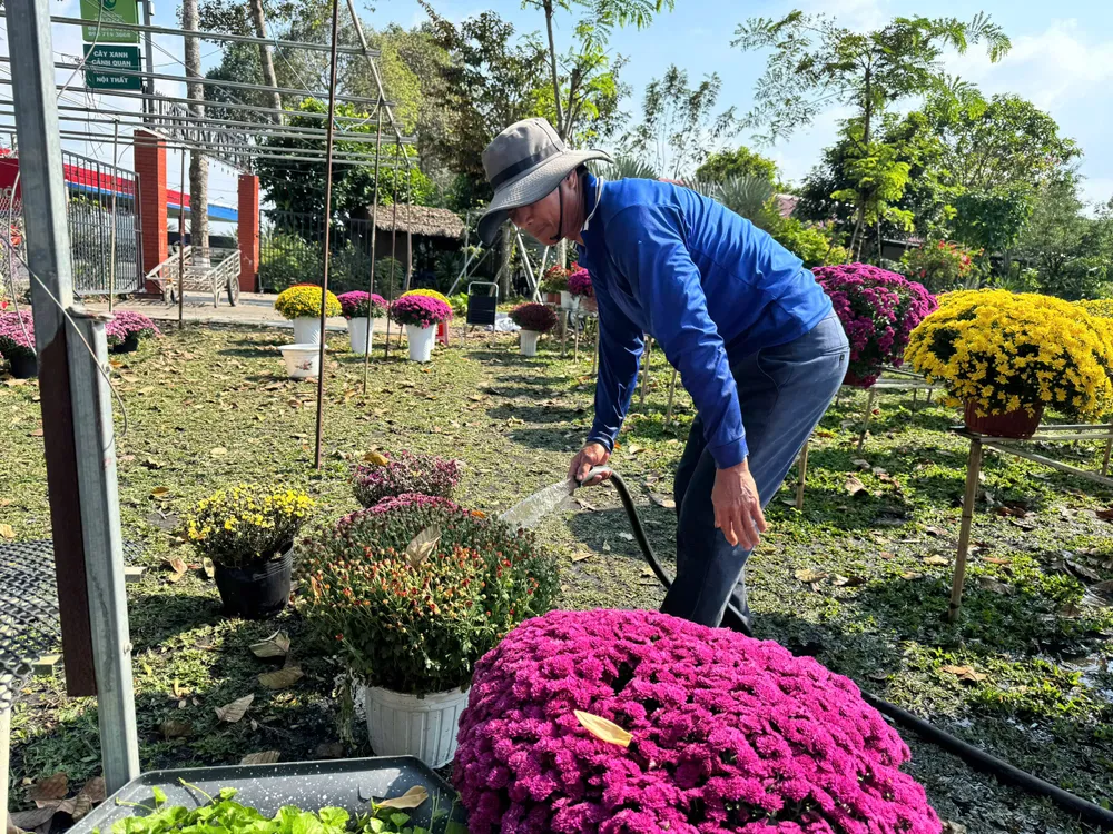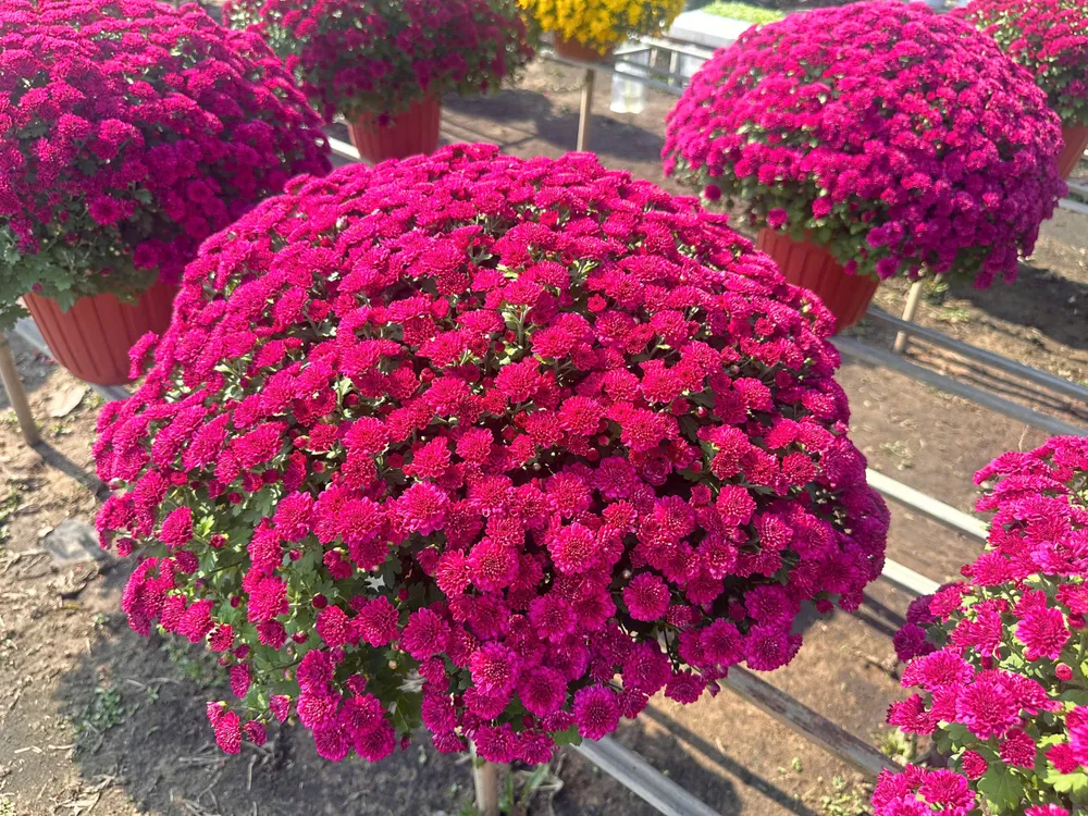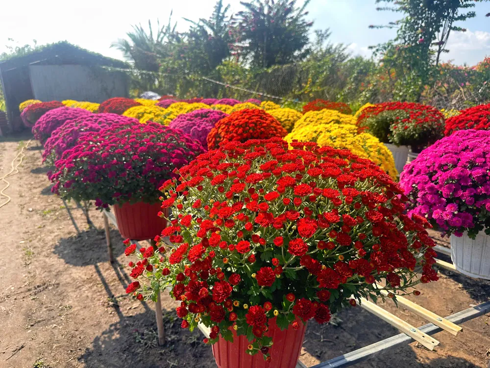 Hộ trồng hoa kiểng Trương Bé Thúy (phường Sa Đéc) đã trồng hơn 1.500 chậu hoa cúc mâm xôi nhiều màu. Đến nay những chậu cúc vàng, đỏ, tím, hồng đã lên màu tươi tắn và được đưa lên giàn để chăm sóc đợi dịp khoe sắc.