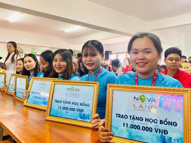 Các em sinh viên hân hoan nhận học bổng do Tập đoàn Novaland trao tặng.
