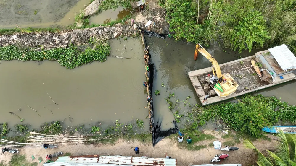 Chính quyền và người dân xã Tân Hưng, tỉnh Tây Ninh gia cố đê bao bảo vệ lúa hè thu 2025. Ảnh: NGỌC PHÚC