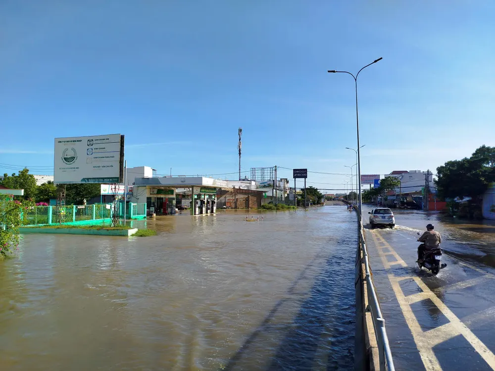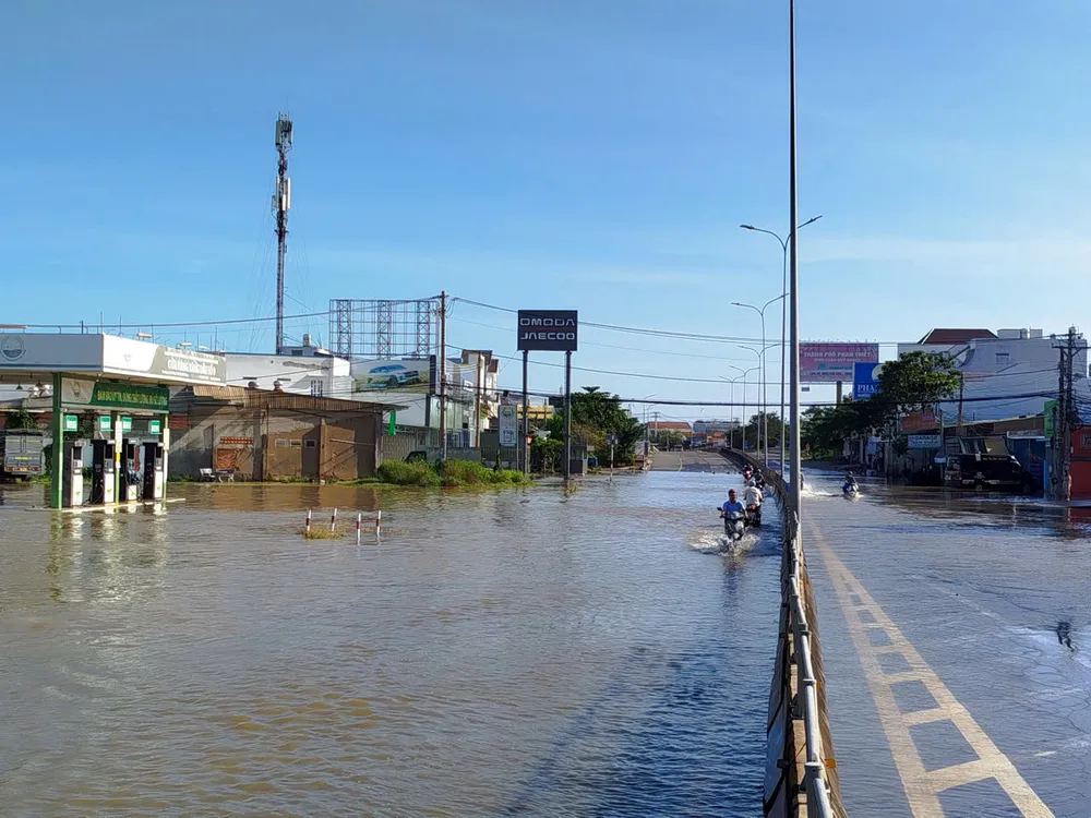 Theo ghi nhận, quốc lộ 1 qua khu vực cầu Bến Lội (phường Hàm Thắng) đang có 2 điểm ngập, đoạn sâu nhất ngập gần 1m, các phương tiện không thể lưu thông. Lực lượng chức năng đã hướng dẫn các phương tiện di chuyển qua đường 706B (đường Võ Nguyên Giáp) để lưu thông.