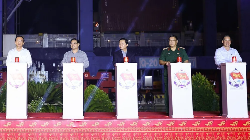 Tại buổi lễ, Thủ tướng Chính phủ và các đại biểu đã thực hiện nghi thức phát lệnh thực hiện chuyến hàng đầu năm Quý Mão 2023 của cảng Tân Cảng - Cát Lái, Tổng công ty Tân Cảng Sài Gòn, mang theo những kỳ vọng, niềm tin vào một năm hoạt động xuất nhập khẩu sôi động, thành công, với kim ngạch tăng trưởng mạnh mẽ.