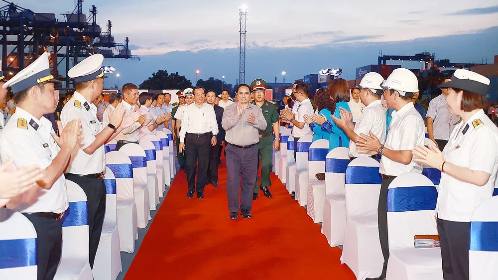 Thủ tướng Phạm Minh Chính, Bí thư Thành ủy TPHCM Nguyễn Văn Nên đến dự lễ phát lệnh thực hiện chuyến hàng đầu năm của Tổng Công ty Tân Cảng Sài Gòn. Ảnh: TTXVN