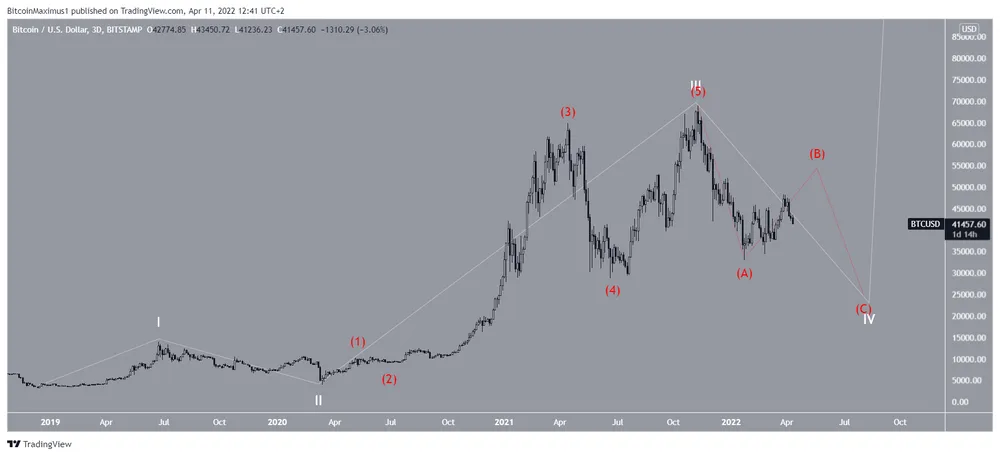 Trong đó, BTC mới chỉ hoàn thành phần đầu tiên của làn sóng bốn (màu đỏ). Sau đó, một mức giảm đáng kể khác sẽ theo sau, cuối cùng đưa giá xuống dưới 30.000 USD.