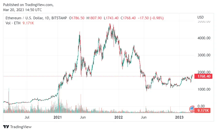 Sau mức cao 1.843,84 đô la vào Chủ nhật (19/3), cặp ETH/USD đã giảm xuống đáy ở mức 1.744,86 USD để bắt đầu tuần mới.