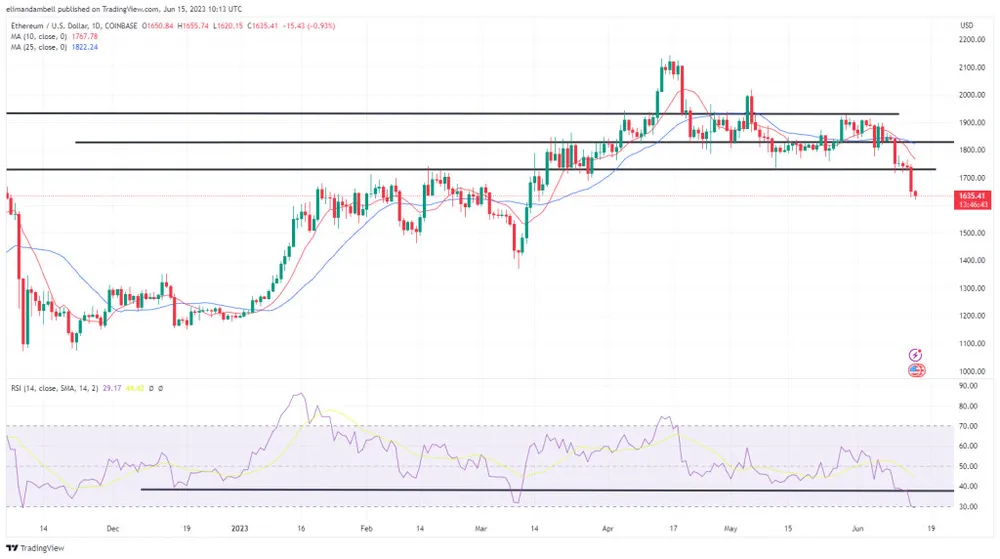 Đây là mức thấp nhất mà Ethereum giảm xuống kể từ ngày 15-3, đây là lần cuối cùng giá được giao dịch ở mức sàn 1.620 USD.