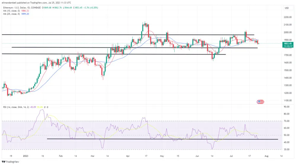 Hiện RSI đang theo dõi ở mức 45,00, điểm kháng cự có thể nhìn thấy tiếp theo nằm ở mức 50,00 và việc di chuyển đến điểm này gần như chắc chắn sẽ đưa ETH đến 1.900 USD.
