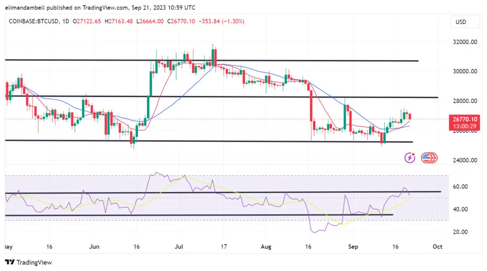 Sau mức cao 27.289,77 USD vào thứ Tư 20-9, cặp BTC/USD đã giảm xuống mức thấp 26.703,77 USD trong phiên giao dịch hôm qua.
