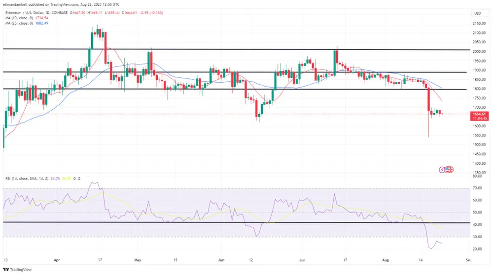 Sau mức cao nhất là 1.679,76 USD vào đầu tuần, ETH/USD trượt xuống mức đáy trong ngày ở mốc 1.651,96 USD.