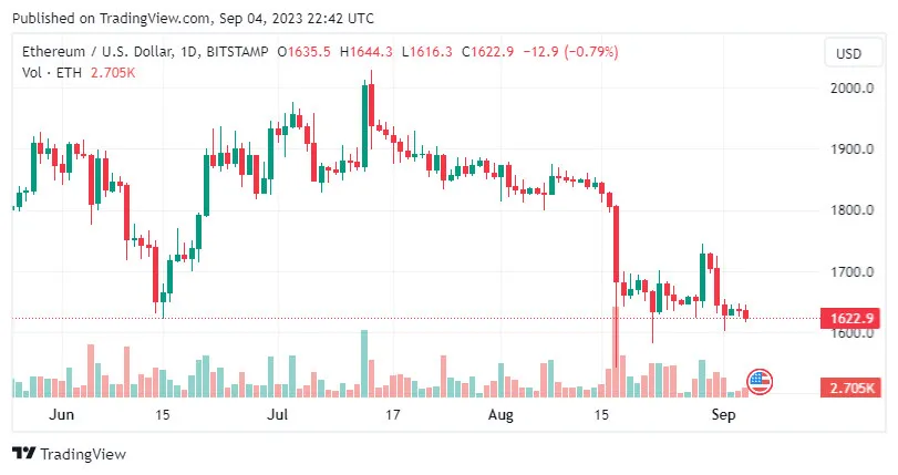 Giá của đồng tiền điện tử lớn thứ hai thế giới kể từ đó đã giảm và hiện đang giao dịch ở mức 1.633,67 USD.