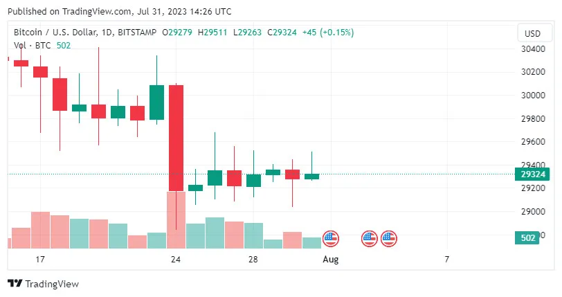 BTC/USD đạt mức cao nhất trong ngày là 29.489,87 USD, sau mức thấp nhất là 29.059,50 USD trong phiên Chủ nhật 30-7.