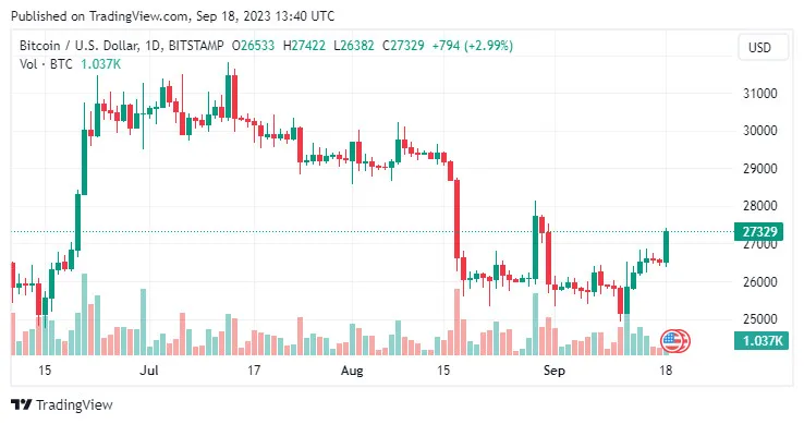 Bitcoin đã leo lên điểm mạnh nhất kể từ ngày 31-8, khi giá đạt đỉnh 27.576 USD.