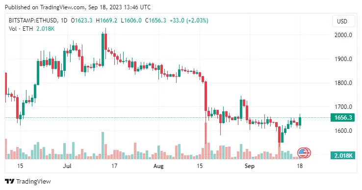 Sau mức thấp 1.609,96 USD vào Chủ nhật 17-9, cặp ETH/USD đã tăng lên mức cao nhất trong ngày là 1.653,07 USD trước đó trong ngày.