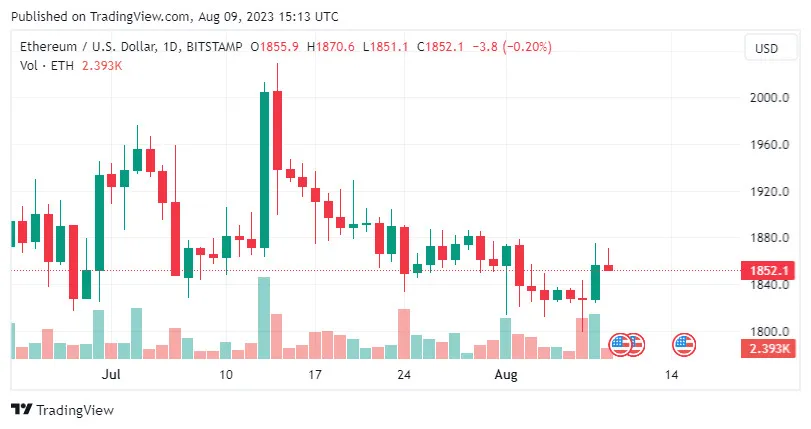 ETH/USD đã đạt đỉnh ở mức 1.873,85 USD vào ngày hôm qua, xuất hiện sau khi giảm trước đó xuống mức thấp 1.831,08 USD.