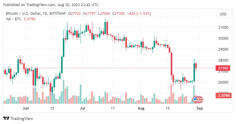 Sau khi giao dịch ở mức thấp 25.998,08 USD vào đầu ngày, BTC/USD đã đạt đỉnh 28.089,34 USD vào cuối ngày thứ Ba 29-8.