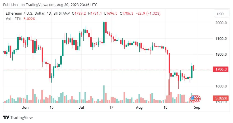 ETH/USD đã tăng lên mức cao nhất trong ngày là 1.742,64 USD trong phiên thứ Ba 29-8, sau khi giao dịch thấp hơn tới 100 USD vào đầu ngày.